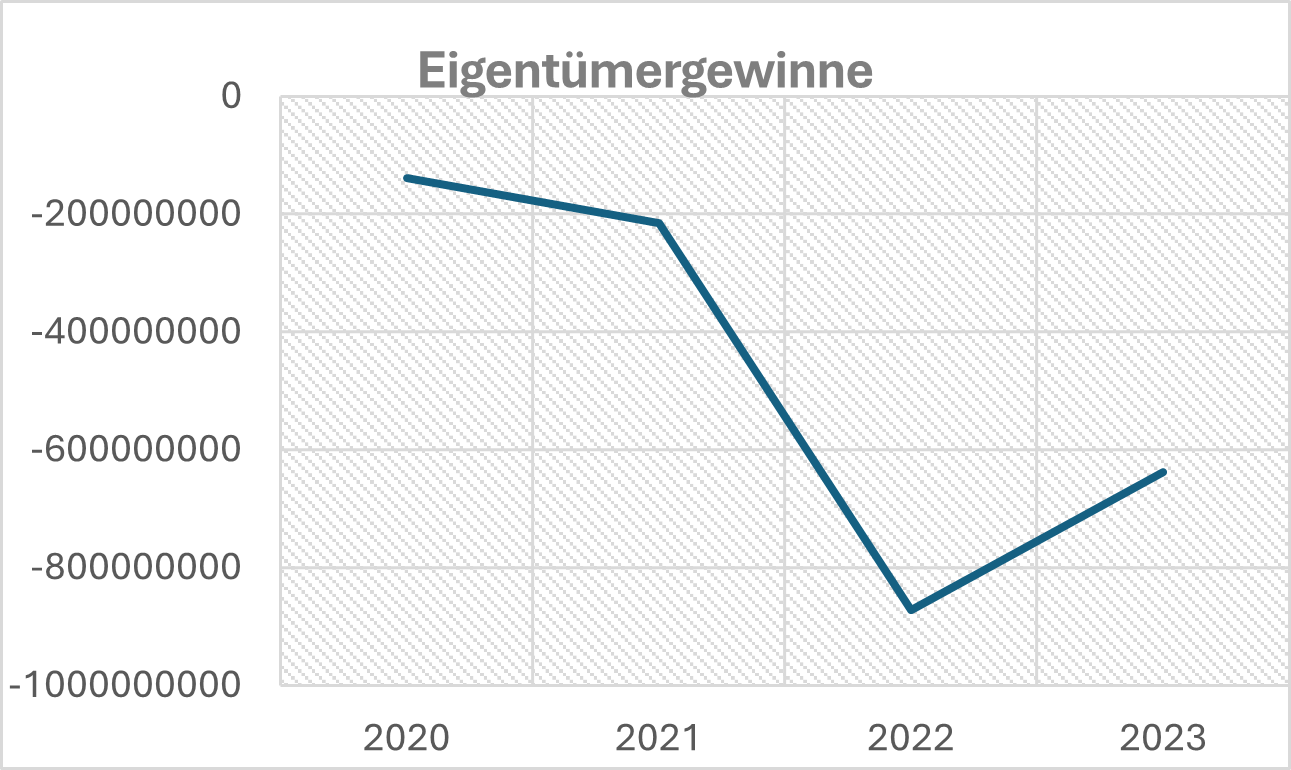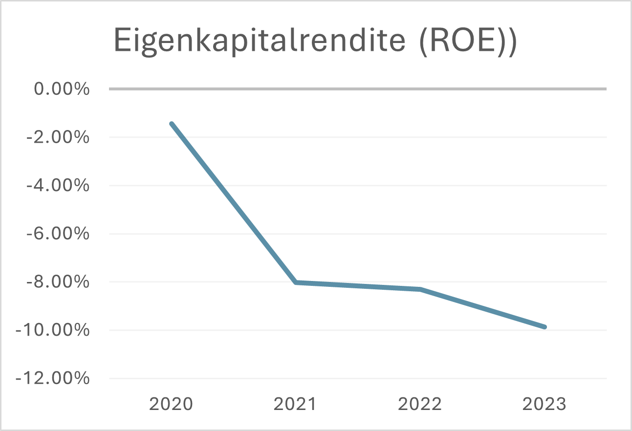 - Eigenkapitalrendite (ROE):: Die ROE ist kontinuierlich gesunken, von -1,43 % im Jahr 2020 auf -9,86 % im Jahr 2023, was auf Ineffizienzen bei der Nutzung des Eigenkapitals zur Erzielung von Erträgen hinweist.