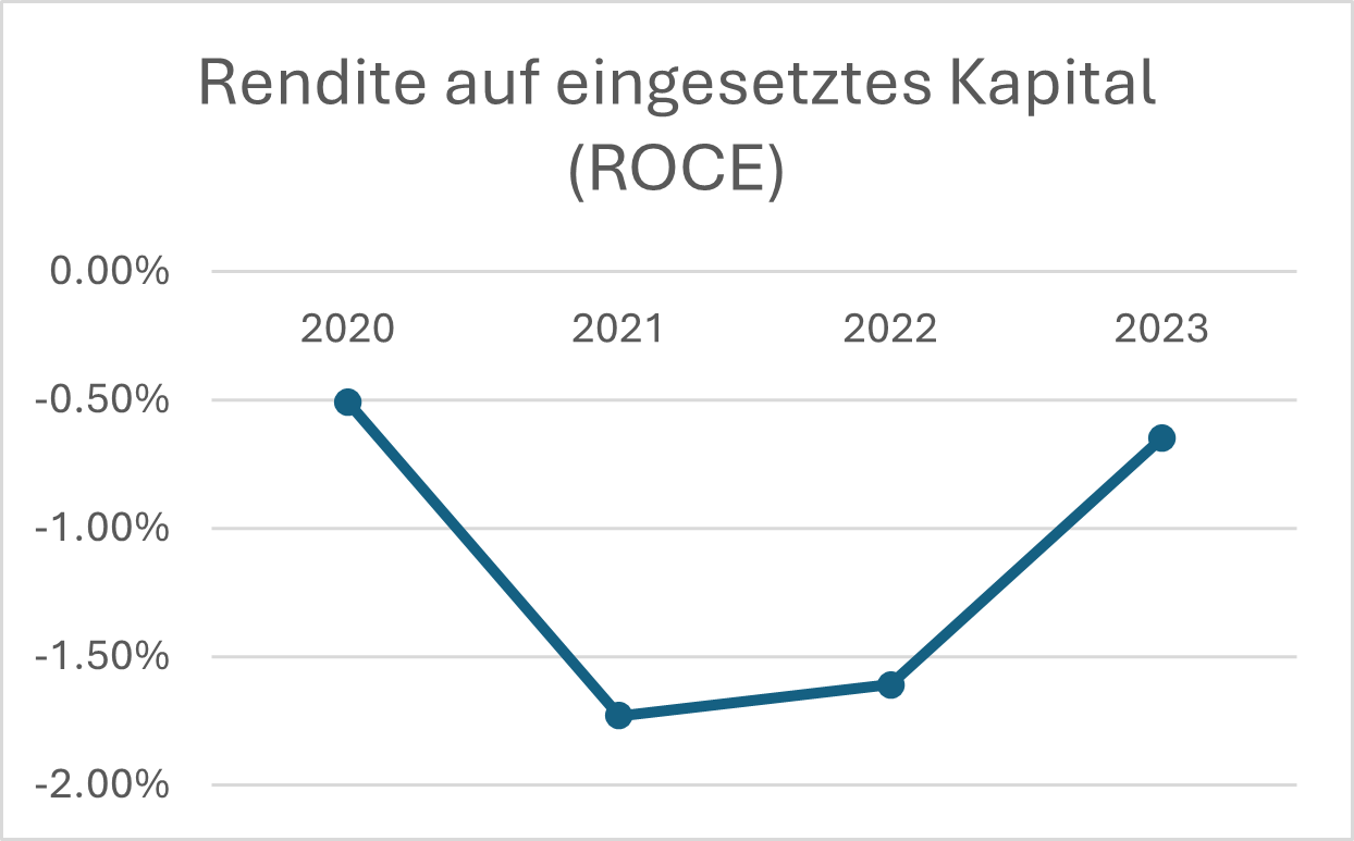 - Rendite auf eingesetztes Kapital (ROCE): Die ROCE blieb während des gesamten Analysezeitraums negativ, von -0,51 % im Jahr 2020 bis -0,65 % im Jahr 2023. Dies deutet auf die Notwendigkeit einer verbesserten Kapitaleffizienz hin.