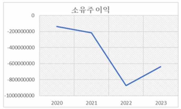- ROE: 2020년 -1.43% → 2023년 -9.86%로 지속 하락, 자기자본 효율 저하.