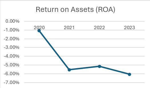 - ROA: Similarly, ROA has fallen from -1.07% in 2020 to -6.07% in 2023, suggesting underutilization of assets and a need for better asset management.