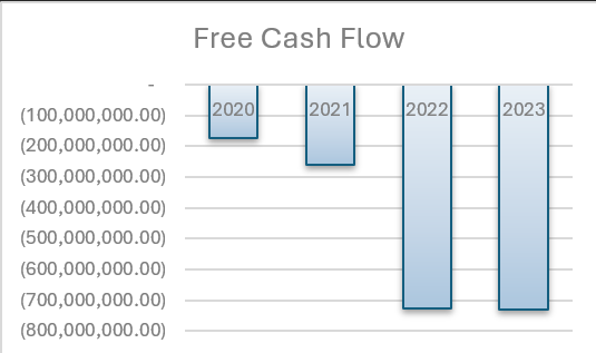 - Free Cash Flow Margin: The free cash flow margin has dropped from -29.98% in 2020 to -91.13% in 2023, underscoring the company’s struggle to generate cash flow to support its expansion.